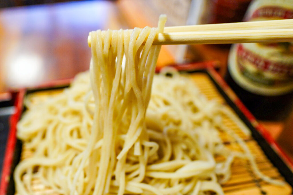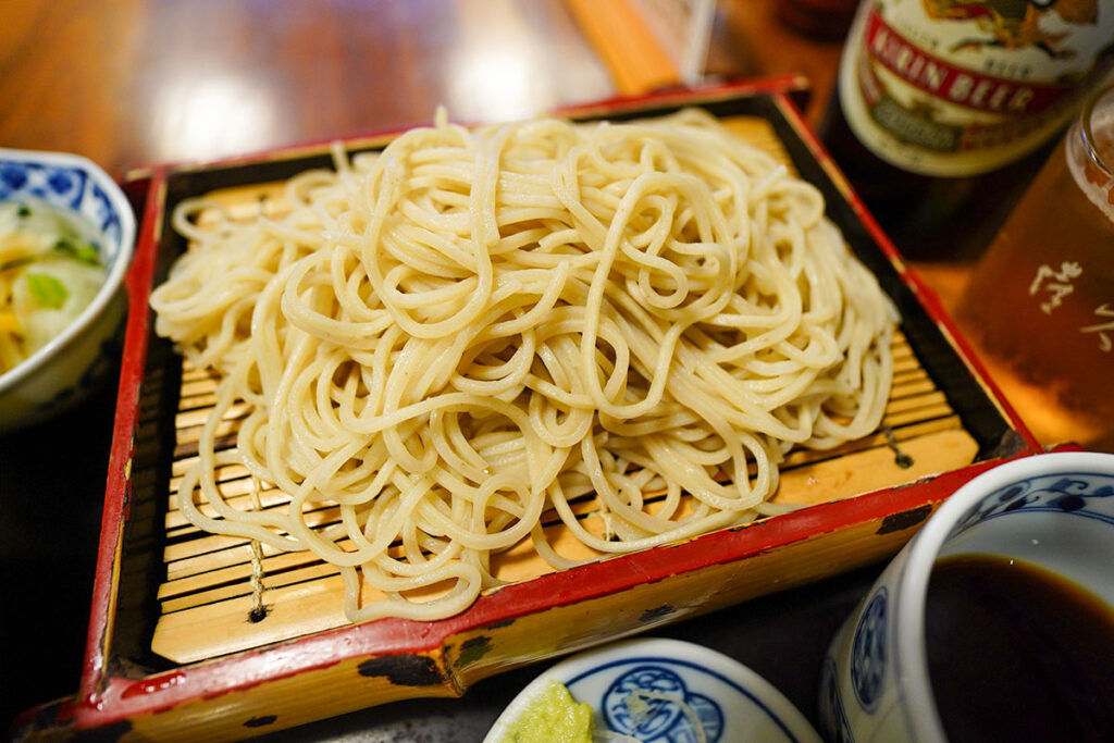 これは蕎麦屋で飲む人にとっての長年の課題。親の世代は、くっついてしまったもりそばに軽く日本酒をかけてほぐしていましたよね。もったいないけれど、銀盤の冷酒をちょっとかけてみましょうか。