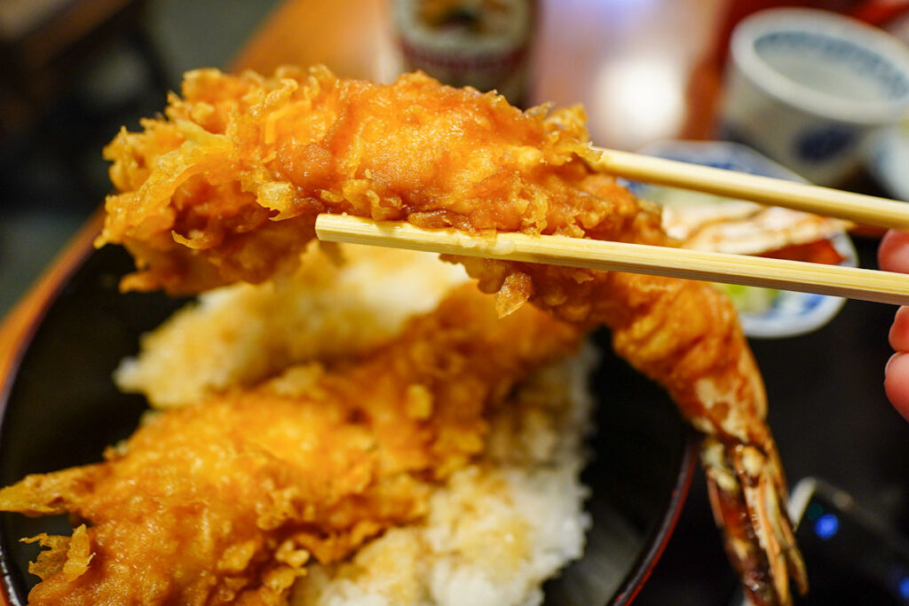 運ばれてきたお盆を見て驚きます。デーンと丼ぶりからはみ出しているのは超巨大な海老2本。もともと海老好きで、居酒屋や天ぷら専門店、蕎麦屋などで頻繁に海老天を食べていますが、ここはそのどれよりも巨大。