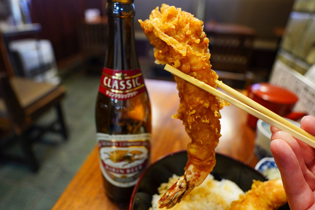瓶ビールの中瓶くらいのインパクトがあり、天丼の器を覆い尽くすほどのサイズ感。