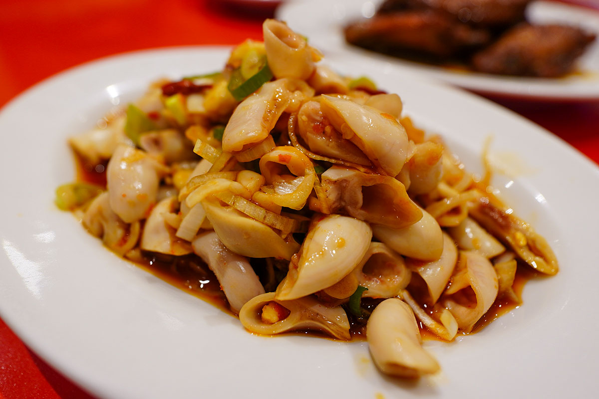 ニンニクが効いた「青菜炒め」や「コブクロ」を、強炭酸の「瓶チュー」で流し込む。台湾産ウーロン茶とライチの組み合わせが絶妙な「旅する瓶チュー」は、刺激的な辛味と驚くほど相性がいいです。