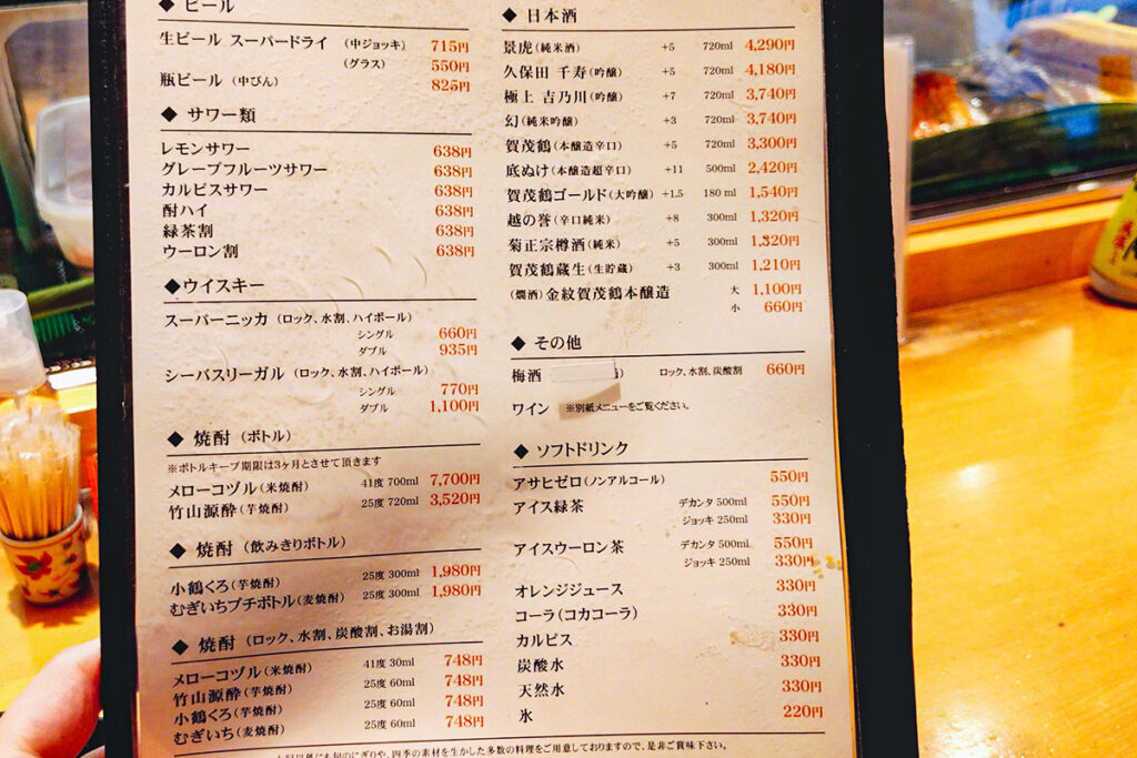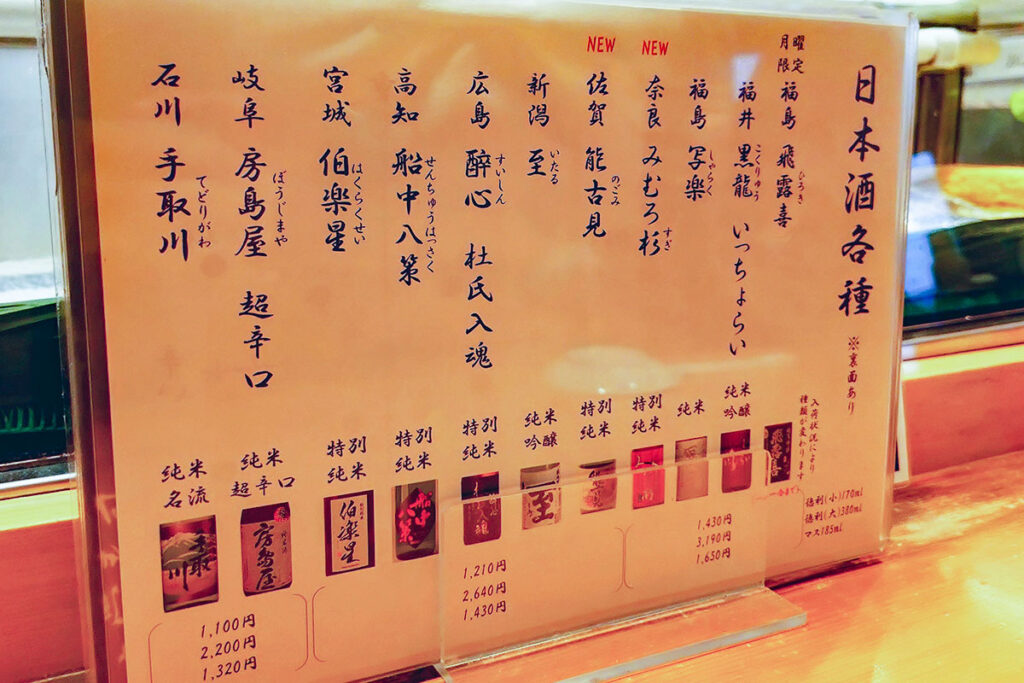 日本酒の種類も豊富。今回は定番として長年取り扱っている広島の銘酒「賀茂鶴本醸造」(小660円、大1,100円)を上燗でもらいました。魚の旨味とお酒の余韻が心地よく調和します。