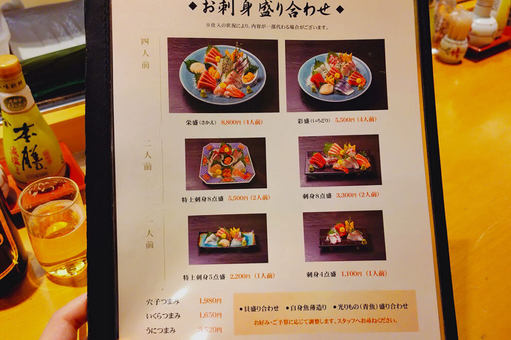 お寿司はお好みで1貫から注文可能。まぐろ(220円)や中とろ(440円)から、定番のネタが揃っています。お刺身の盛り合わせも1人前(1,100円)から頼めるため、少人数での飲みにも重宝します。