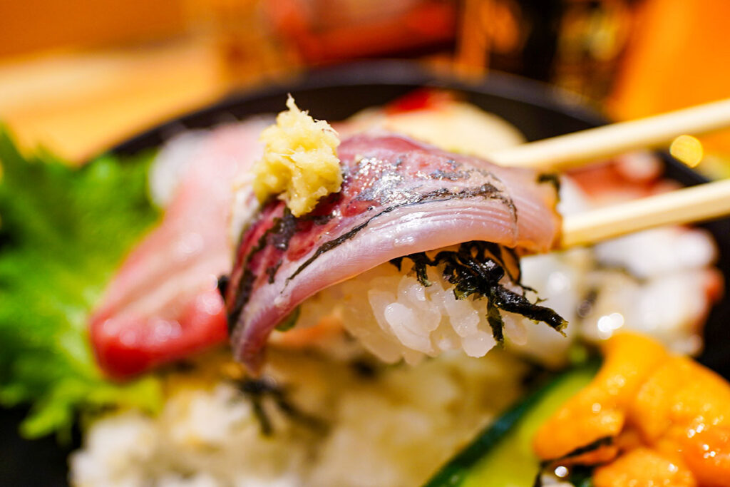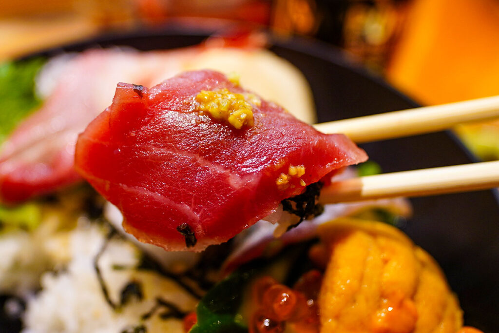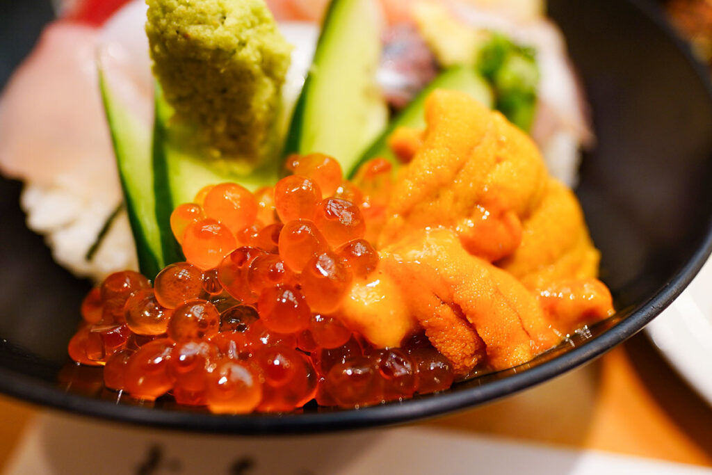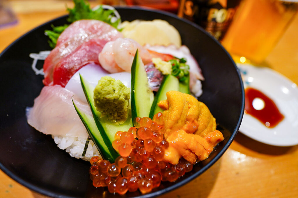 丼には、脂の乗った中トロ、たっぷりのウニ、イクラ、甘エビ、ヒラメ、アジ、タコなど、人気のネタが敷き詰められた一杯。