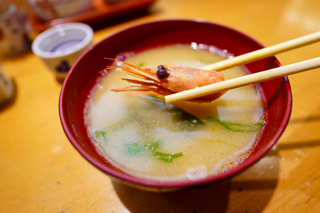 お味噌汁には海老の頭が入っており、出汁の深い香りが広がります。