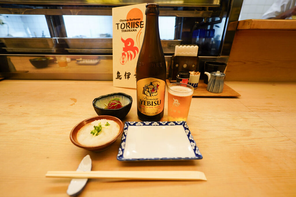 まずはヱビスビールの中瓶(902円)をもらって、喉を潤します。お通しの小鉢や大根おろしをつまみながら焼き上がりを待つ時間も、焼鳥店ならではの楽しみ。