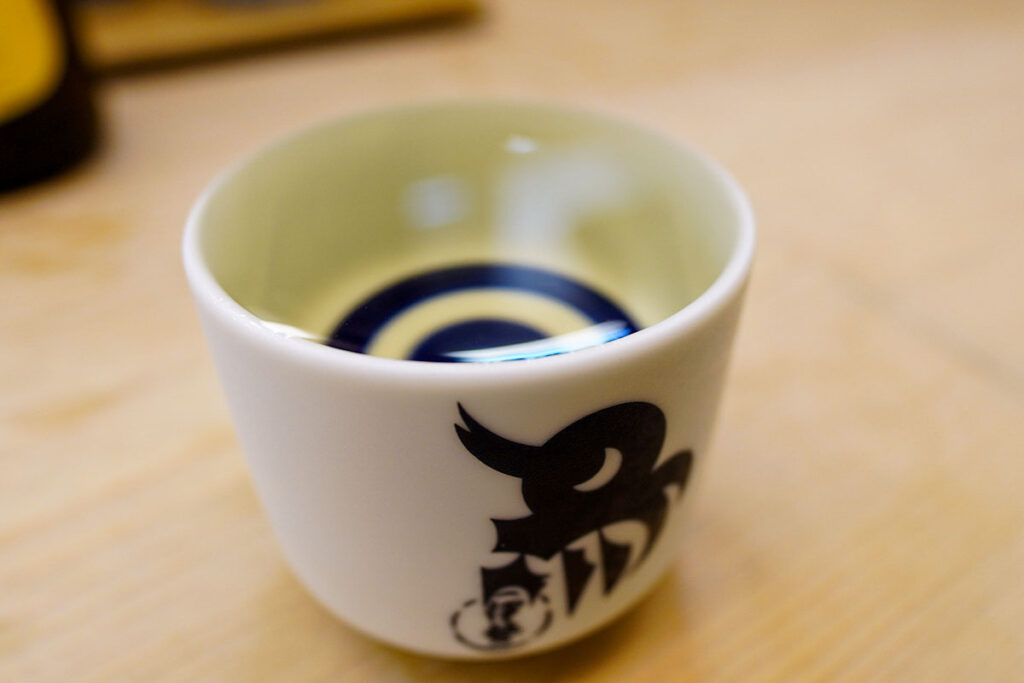 ぐい呑み(1,210円)になみなみと注がれた樽酒は、口に含むと杉樽特有の清々しい香りが鼻を抜けていきます。独特な風味が、炭火の香ばしさをまとった鶏肉と実によく合います。