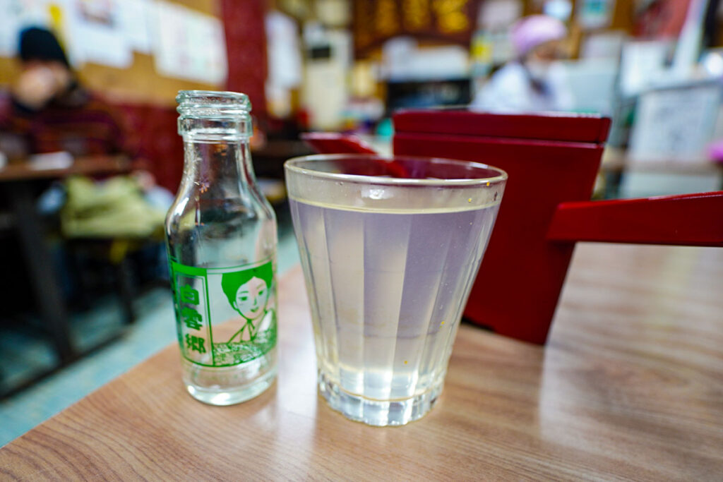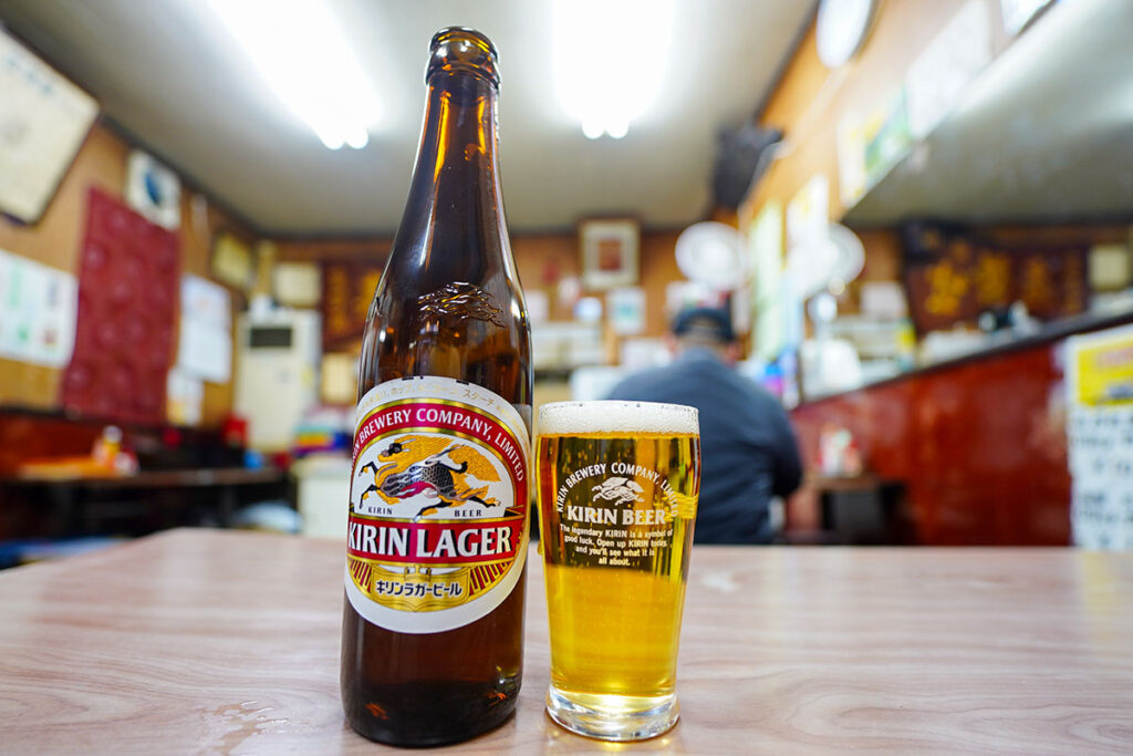 まずは瓶ビール。キリンラガービールの小瓶をもらって乾杯。