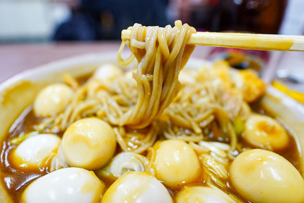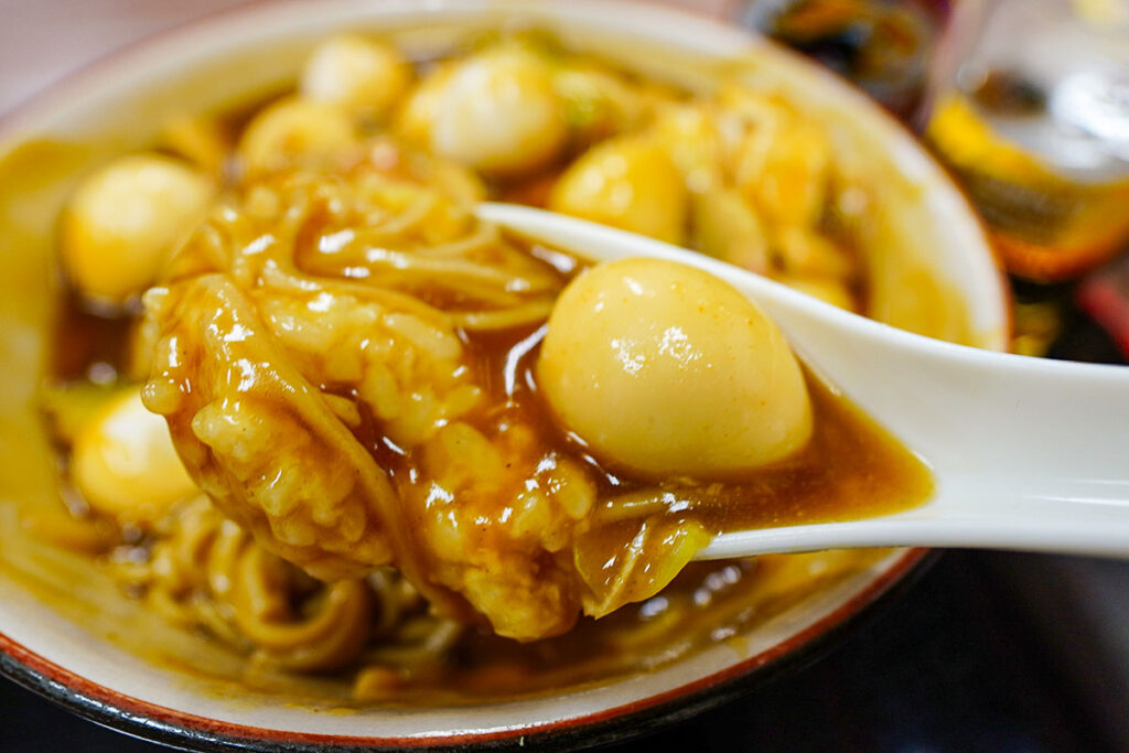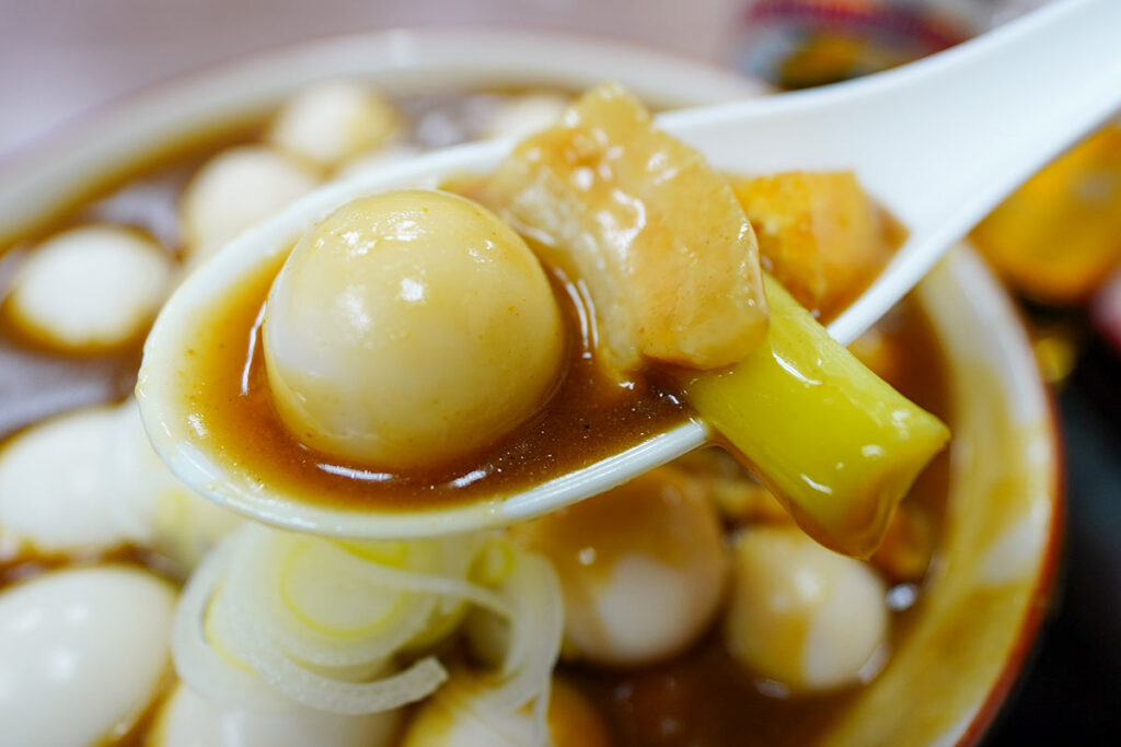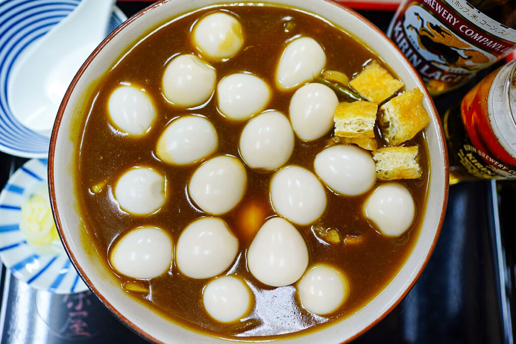 カレーを埋め尽くすように浮かんだうずらの卵も立派な酒の肴。これはビールだけでは足りません。
