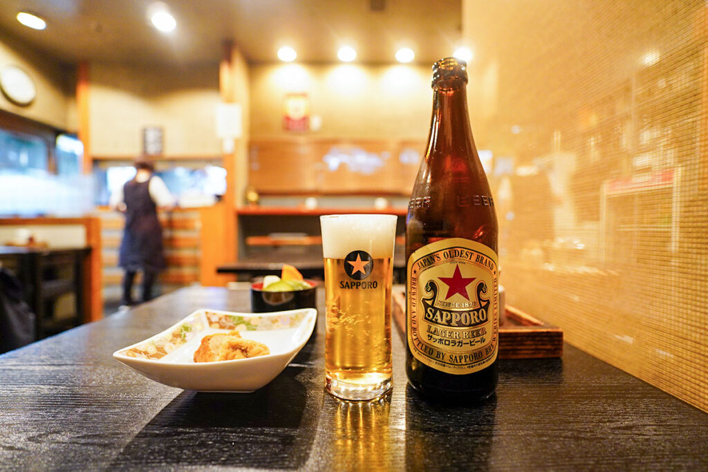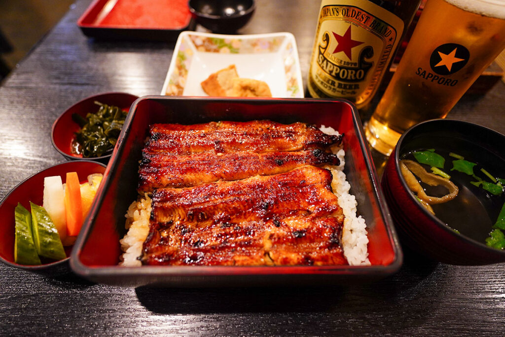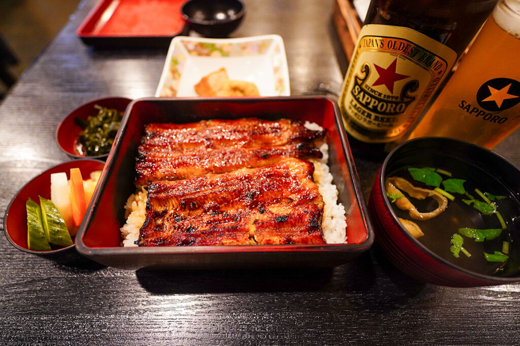 席に着き、まずはサッポロラガービールの中瓶を注文。よく冷えたビールを専用のグラスに注ぎ、乾杯!いつもの銘柄も、炭焼き香る鰻屋さんで飲むと一層特別な味に感じます。