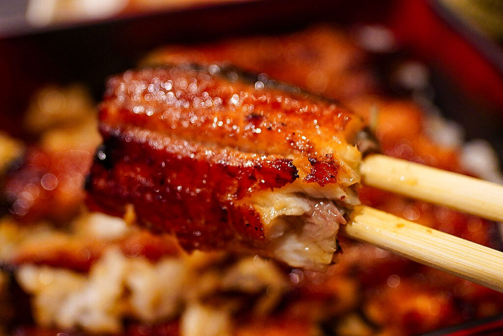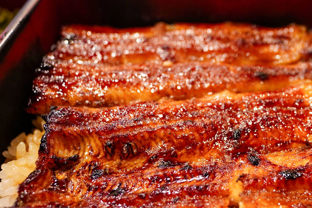 到着した朱色の重箱の蓋を開けると、きれいに焼き上がった蒲焼が湯気とともに姿を現します。