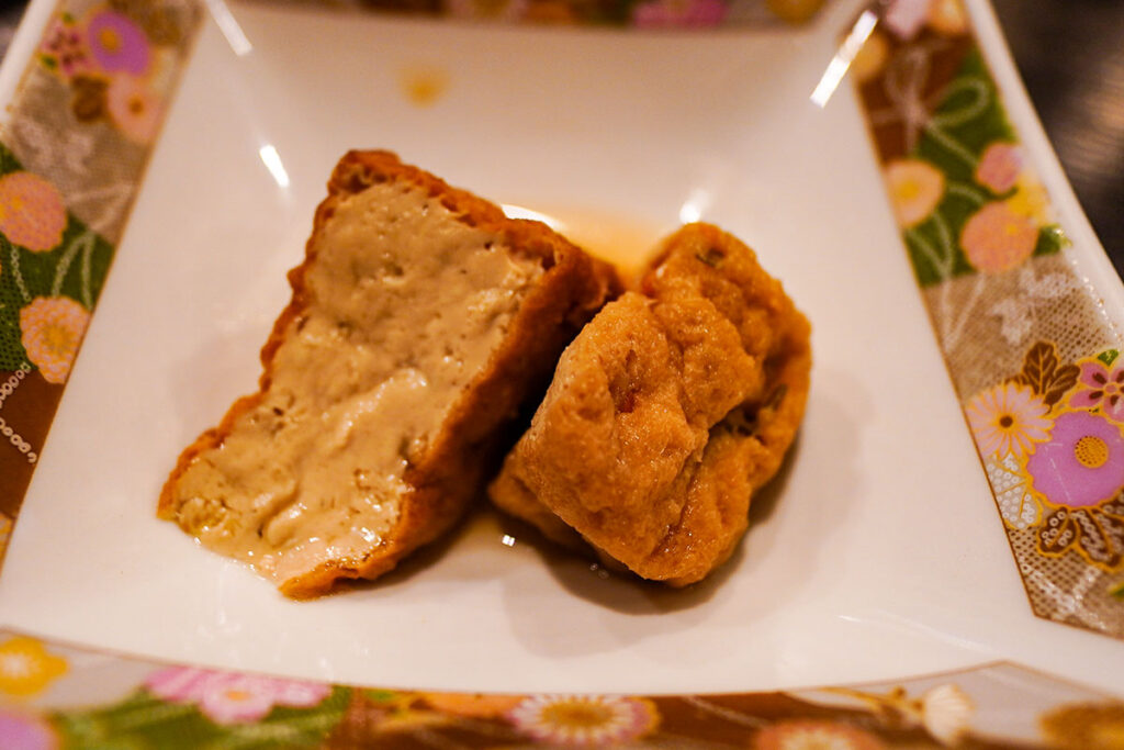 お酒を注文すると、ちょっとしたお通しがでてきます。しゅんでいる、がんもと厚揚げ。
