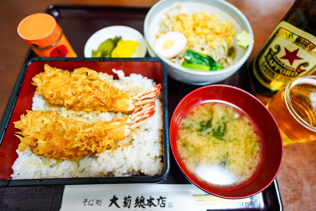 蕎麦屋ならではの天丼と赤星の組み合わせ