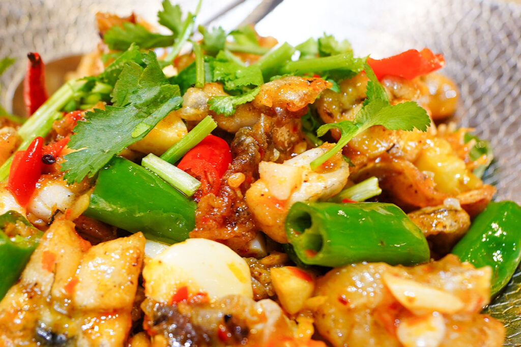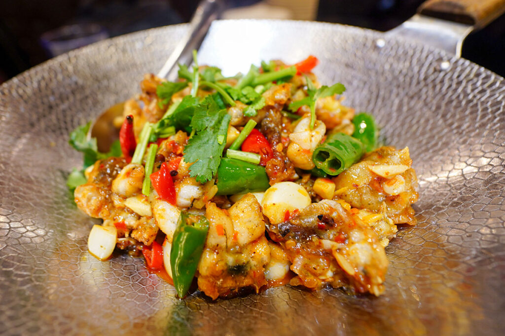 強火で熱された鍋の中でニンニクや唐辛子、香味野菜とともに炒められた牛蛙は想像以上に洗練された味わい。食感は河豚(ふぐ)と鶏肉の間の子のようで、身はプリプリとして弾力があり味は淡白で上品です。刺激的なスパイスの味付けが淡白な肉質と見事に調和し箸が止まらなくなります。