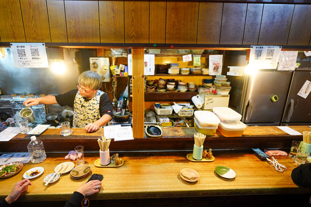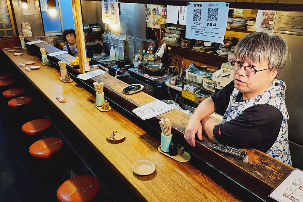 引き戸を開けると、使い込まれた木製カウンターと奥にテーブル席があるコンパクトな空間が広がります。初代の奥様であるお母さんと、息子さんの2代目ご主人の2名で切り盛りされる家族経営のお店です。