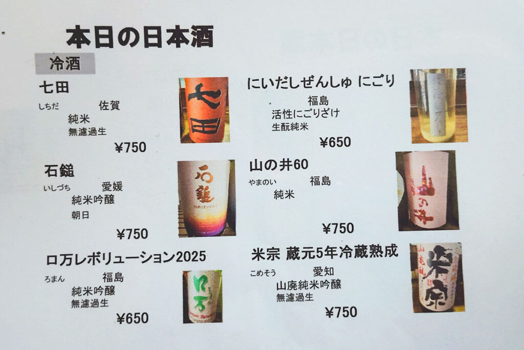 メニューには福島の「ロ万 レボリューション2025」や佐賀の「七田」など、料理を引き立てる全国の地酒が手頃な価格で並んでいます。