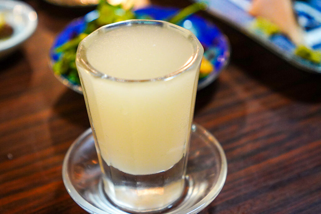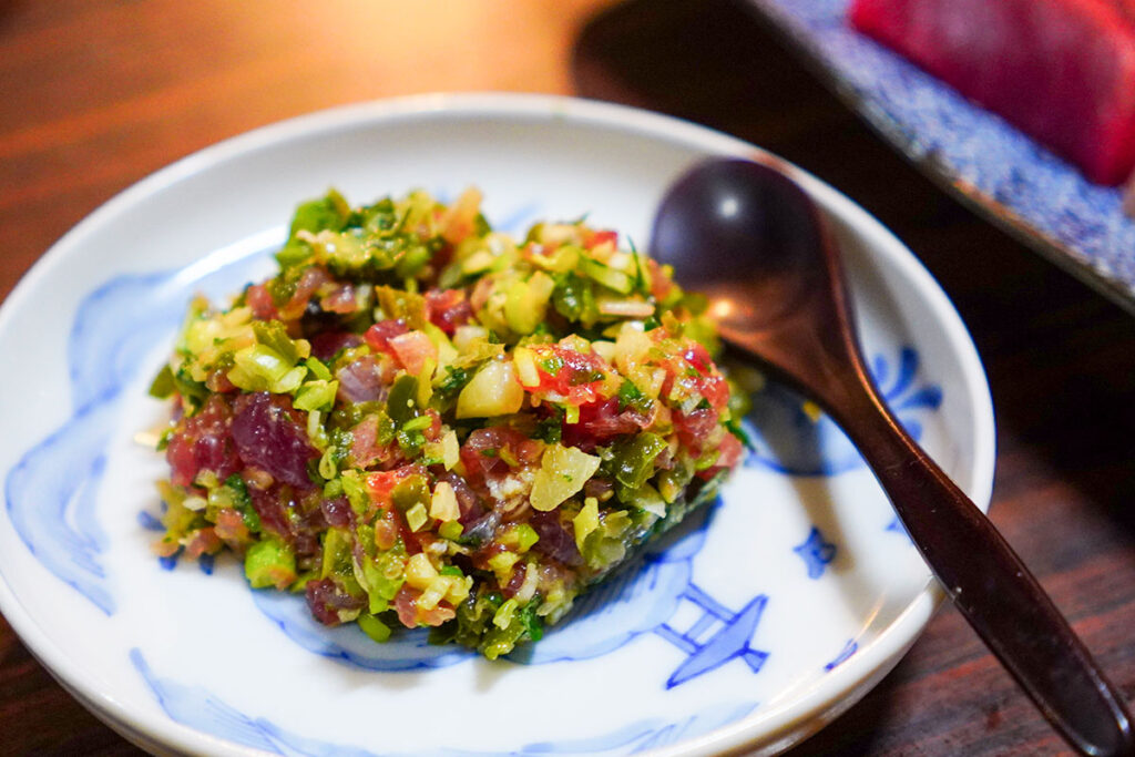 赤身の旨味に青唐辛子の鮮烈な辛味が重なり、日本酒が次々と空になっていきます。