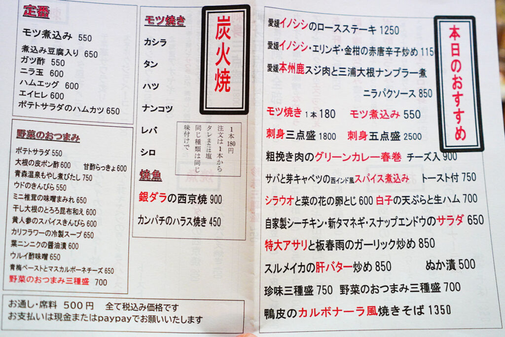 お母さんが担当する定番のもつ焼きや煮込みをベースに、大将が手がける天然魚介やエスニック料理、ジビエが加わる、老舗ながら個性の効いた品揃えが特長。世代の違う二人の料理が違和感なく同居しているのが、このお店の最大の魅力です。