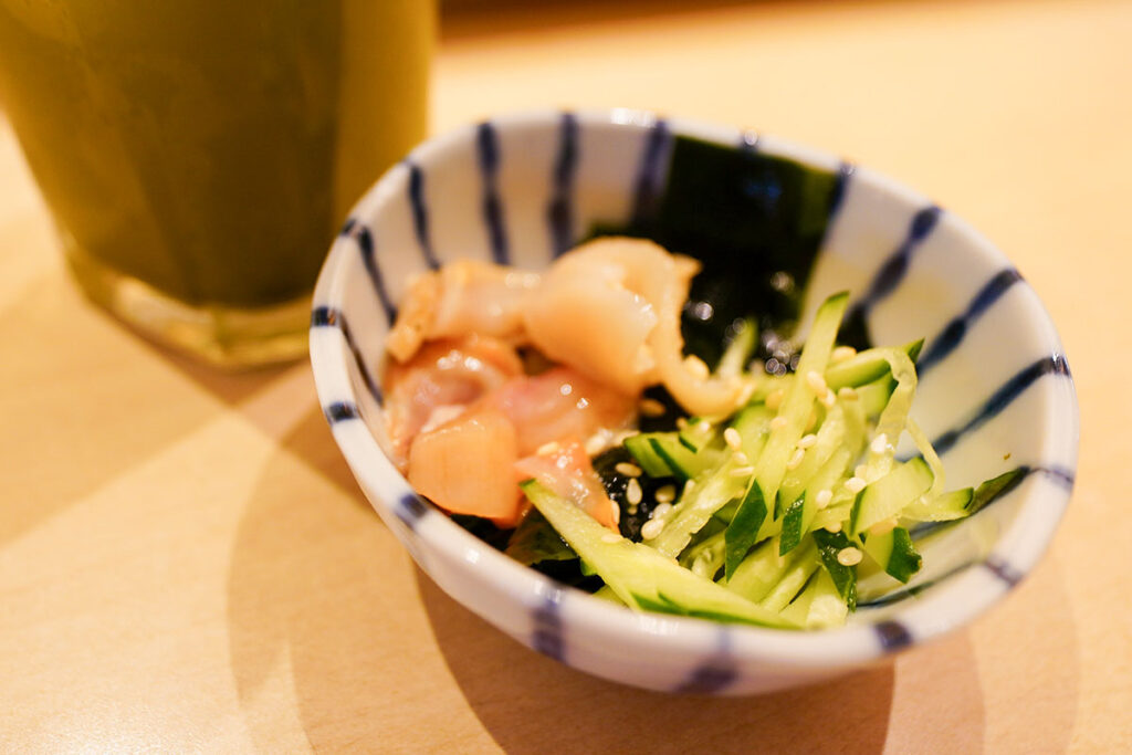 お通しは貝のヒモとキュウリを和えたもの。気の利いた小鉢が出ると、お酒が進みますね。