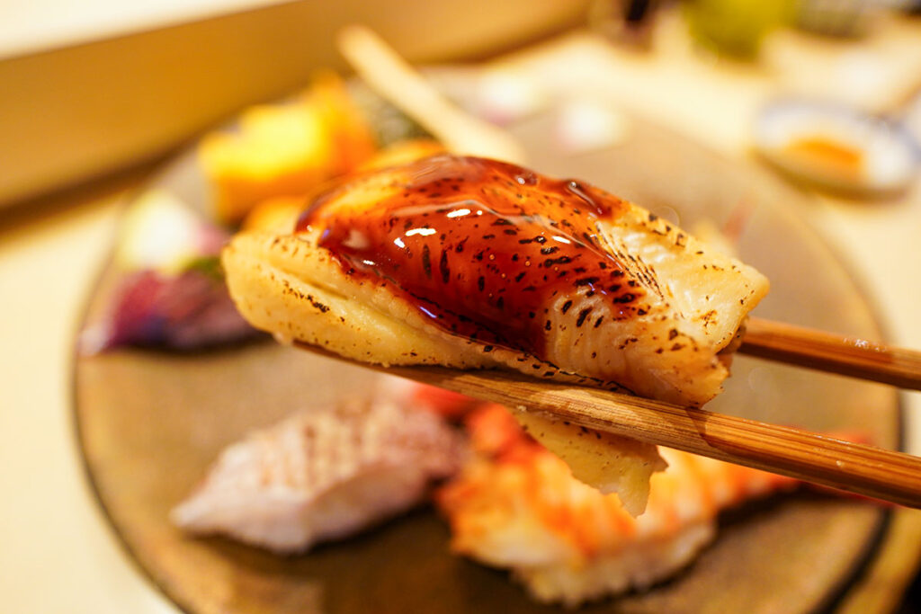 そして、こちらで外せないのが穴子です。ふっくらと煮上げられ、たっぷりのツメが塗られた一貫は、口の中でシャリと一緒にとろけていきます。これぞ伝統の江戸前の技。