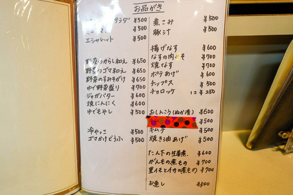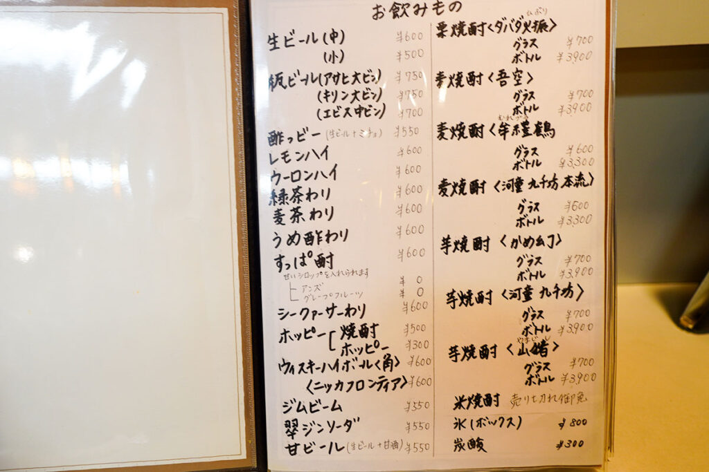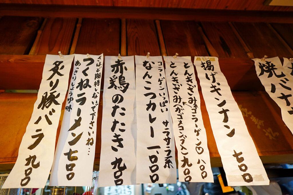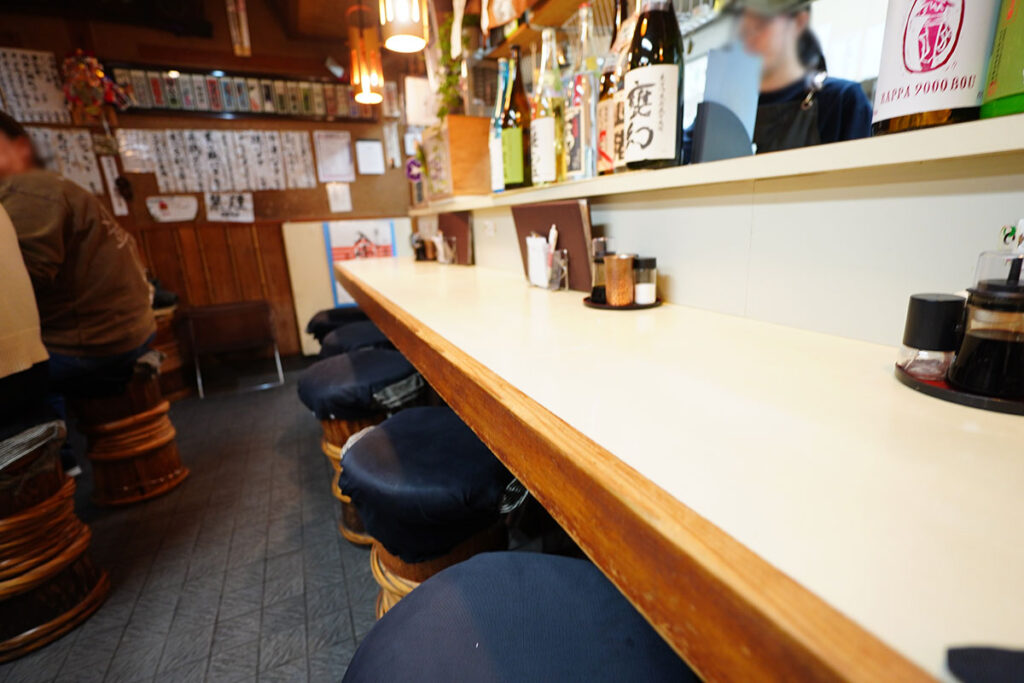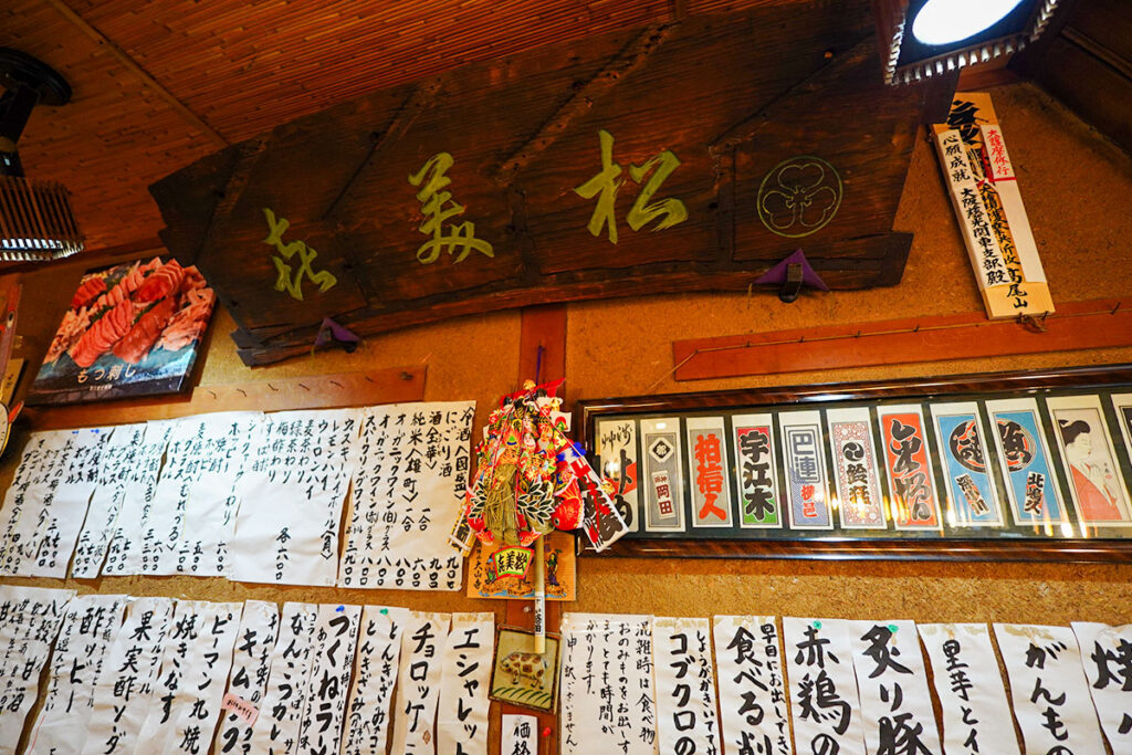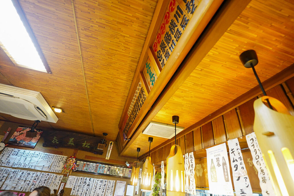 店内に入ると、年季の入った木製の看板や短冊メニューが壁を彩り、歴史を重ねた酒場ならではの重厚感に包まれます。