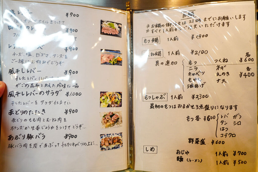 以前は、モツ刺しが評判で予約必須でしたが、規制などにあわせメニューを変更。現在はモツマニア相手というよりは、地域密着の美味しい肉料理が楽しめる落ち着いた居酒屋といった雰囲気です。