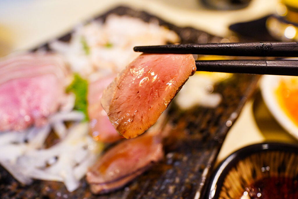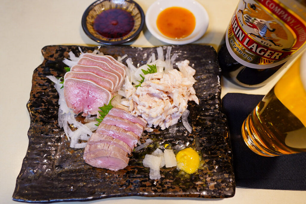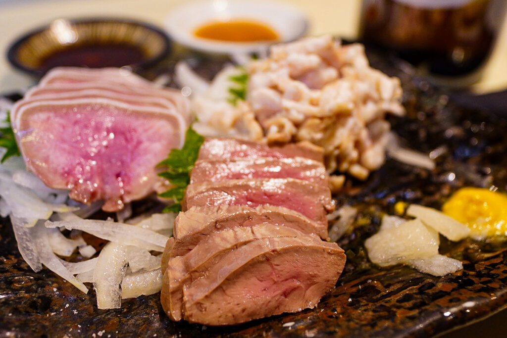 料理は看板メニューのゆでもつ刺しから。一人で訪れた際にも頼むのに丁度良いハーフサイズ(各450円)が用意されているのが嬉しいポイント。今回は「しろ刺し」と「タン刺し」を注文。すると、大将の心遣いで「はつ刺し」も追加していただき、立派な三点盛り(900円)で提供されました。