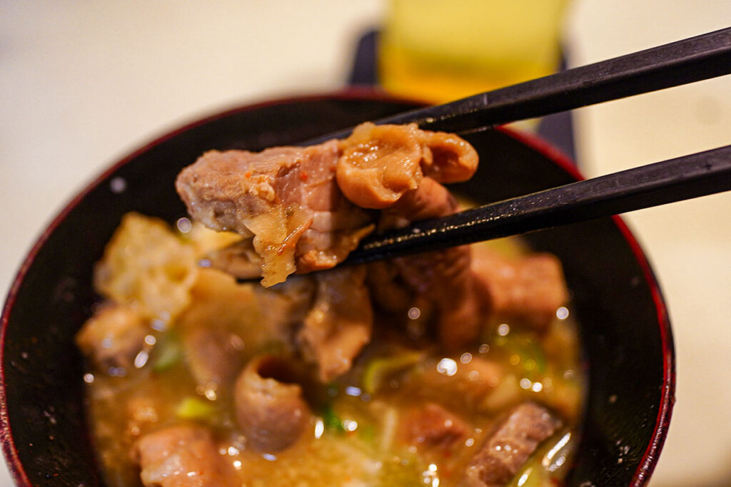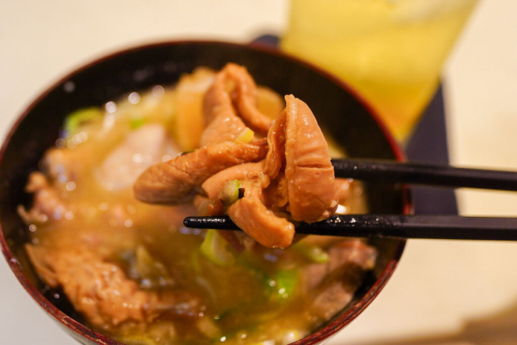 しろだけでなく、様々な部位が煮込まれており、ネギの風味とともに深い味わいを堪能できます。