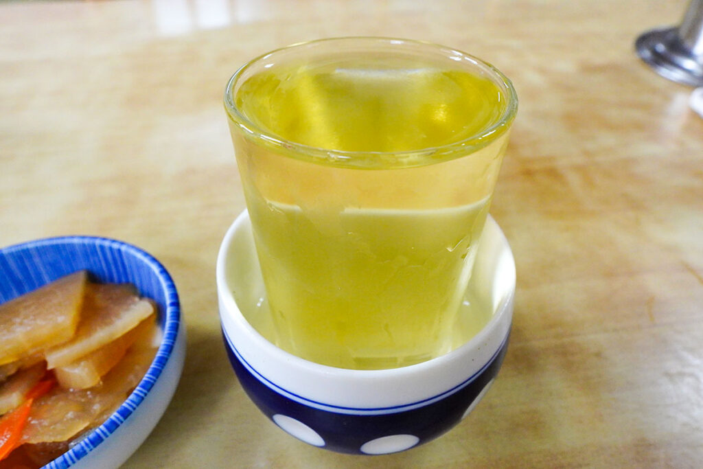 席に着くと急須でお茶が出されます。まずは山梨ならではの「ぶどう酒」を注文しました。一升瓶から厚手の湯呑みになみなみと注がれるのが甲州流。
