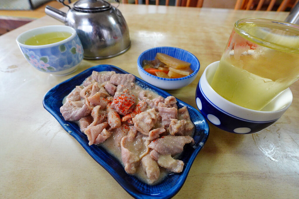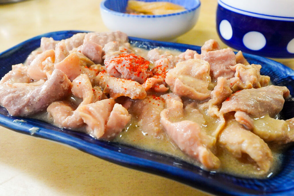 肴には名物の「もつ皿(500円)」を選びました。甲州の郷土料理といえばモツ。豚のシロモツだけでなく、鶏や馬モツも日常的に食べられています。
