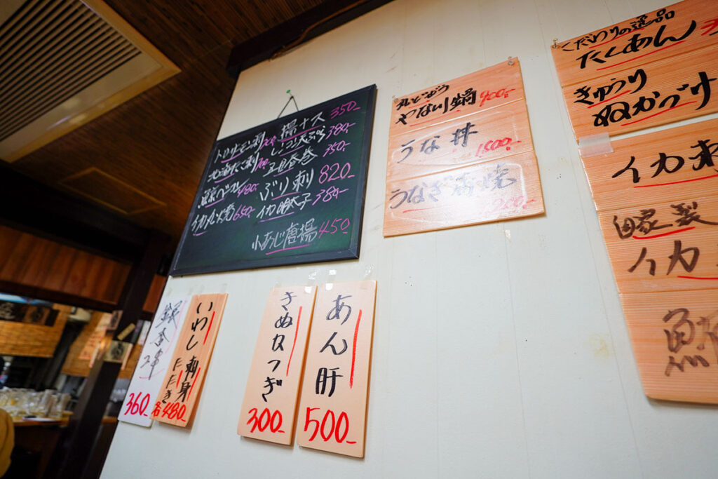 メニュー表にはお刺身から焼き物、揚げ物まで居酒屋の定番がずらり100種類近く並びます。