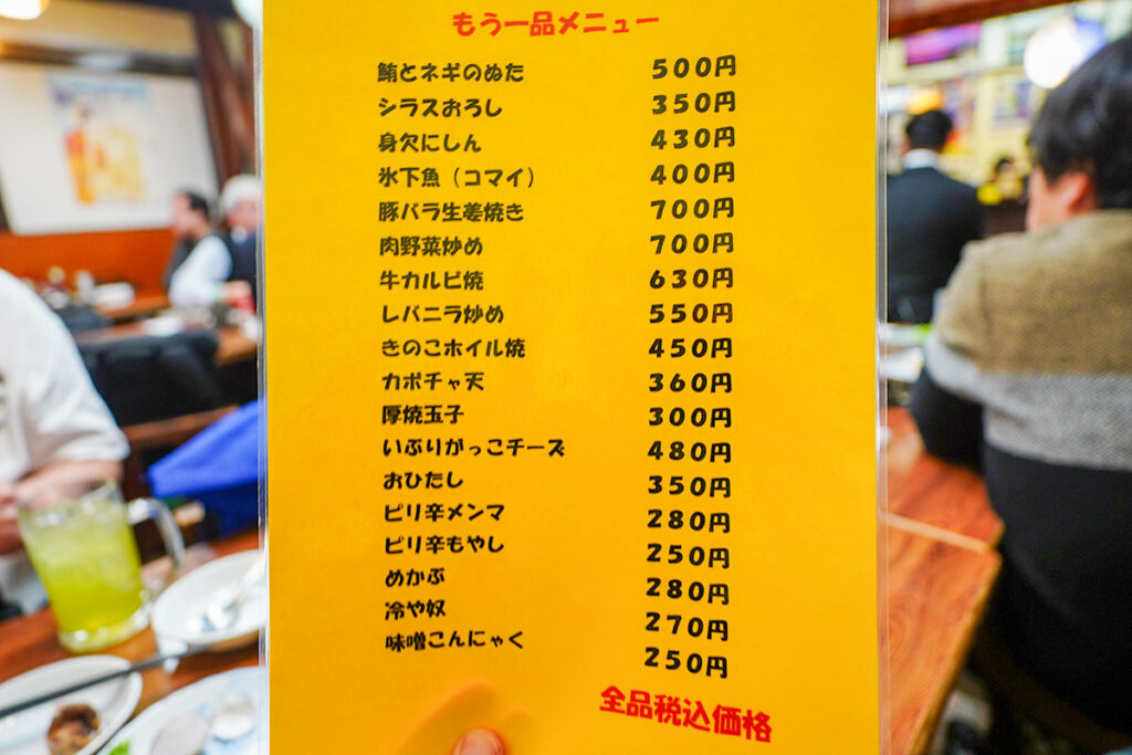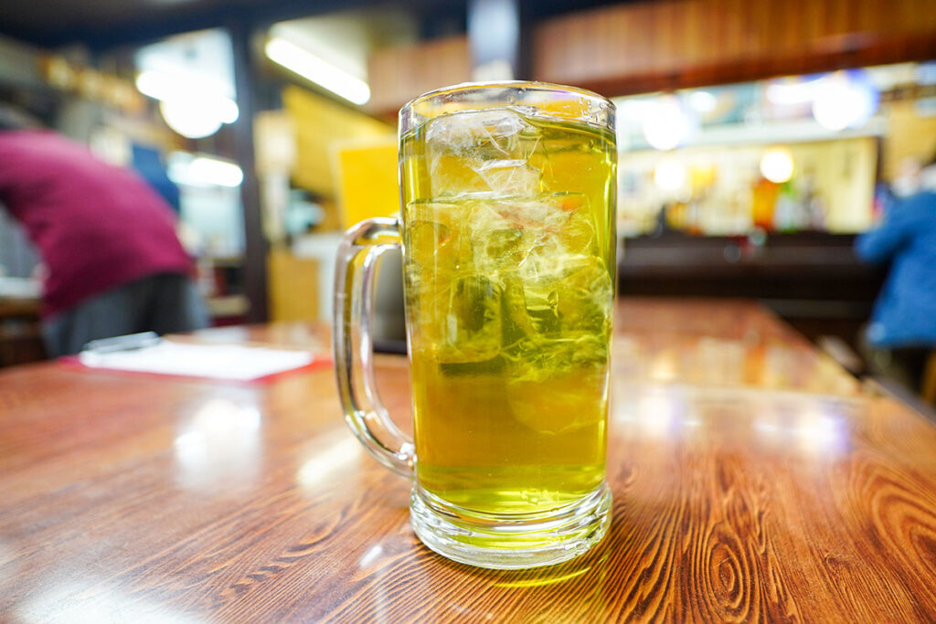 席に着き、まずは「緑茶ハイ(400円)」で喉を潤します。老舗酒場で見かける色の濃い”玉露”的なお茶ですね!大きめのジョッキになみなみと注がれた一杯が嬉しい。