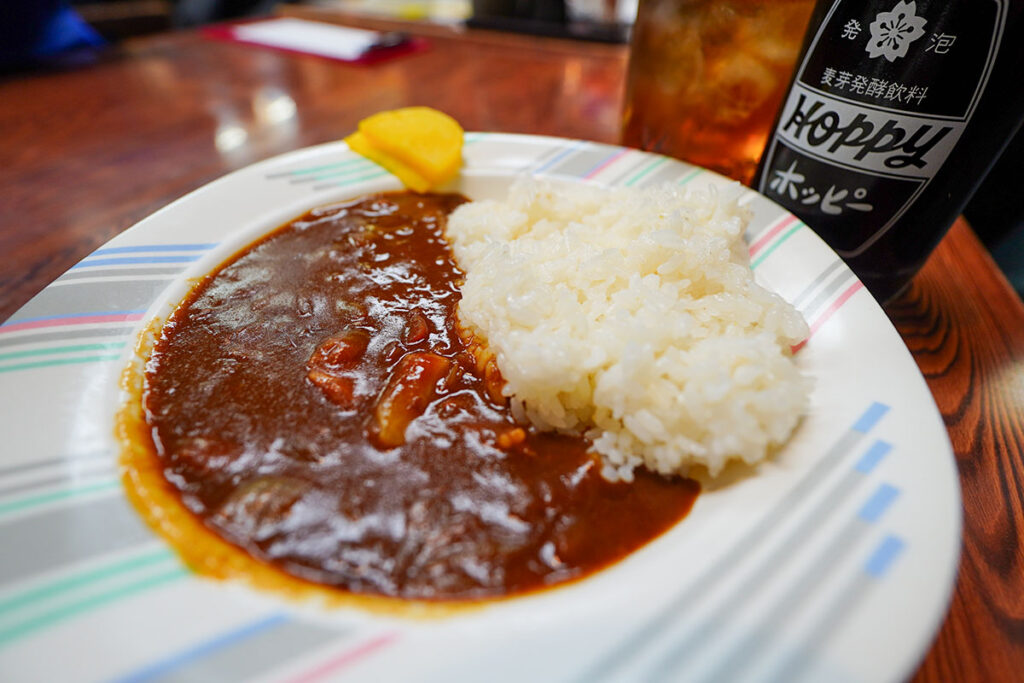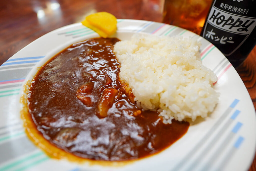 「カレーライス(550円)」と「黒ホッピー(490円)」の組み合わせが相性抜群なのだと、常連さんに聞いてからずっと食べてみたかったのです。
