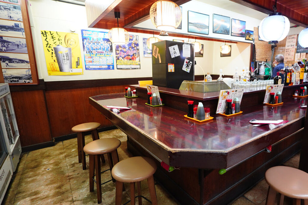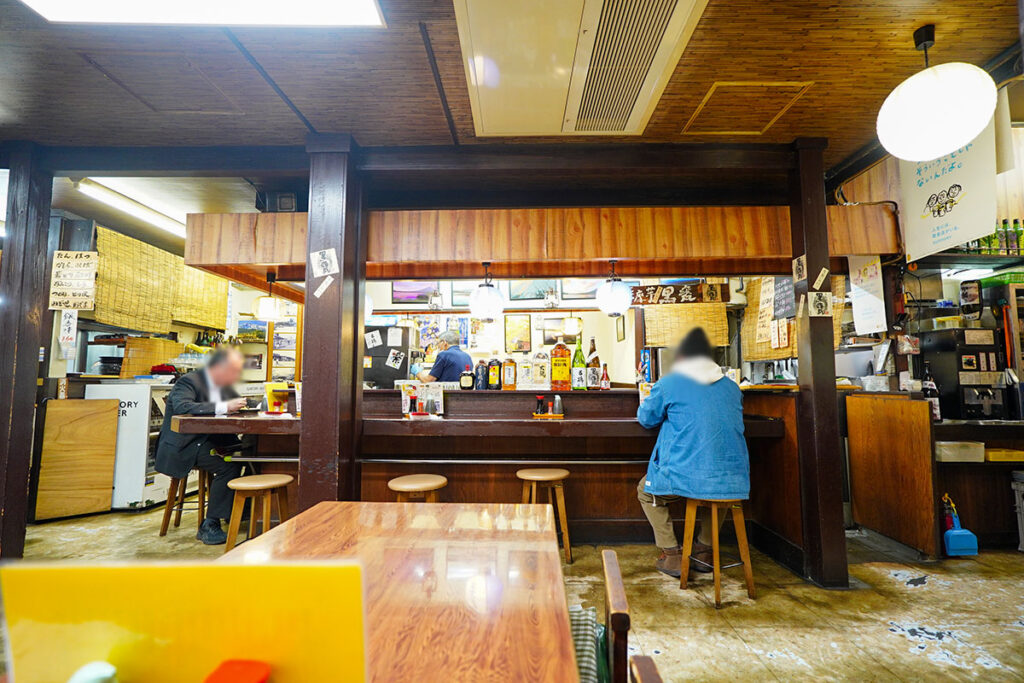 店内もまったく内装をいじっていないのでは?と思えるほどレトロなままなんです。壁には短冊メニューやレトロなポスターが貼られ、使い込まれた椅子やテーブルが長年愛されてきた月日を物語っています。