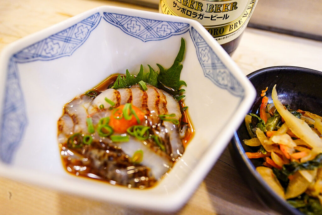 最初の一品は、コリコリとした食感が心地よい「なまこ酢」。もみじおろしとネギの風味が、さっぱりとした酸味を引き立てます。お通しの切り干し大根とともに、ビールがどんどん進む味わい。