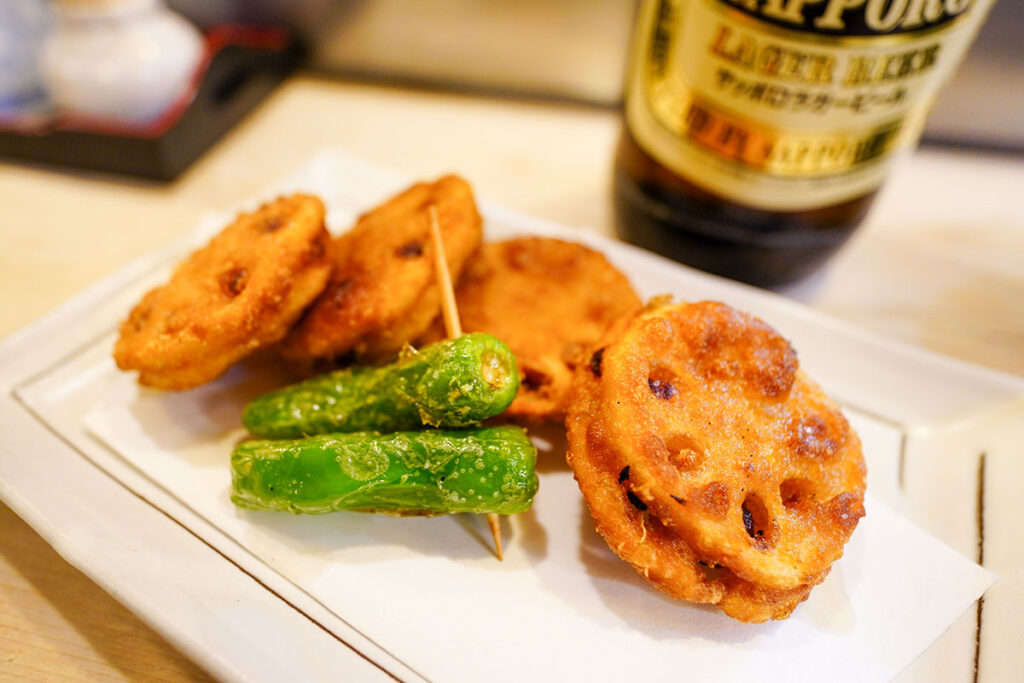 続いて運ばれてきたのは、きつね色にカラッと揚がった「レンコンはさみ揚げ」です。サクサクの衣とレンコンの歯ごたえ、中に挟まれた挽肉の旨味が絶妙なバランスで混ざり合います。付け合わせのししとうのほろ苦さも良いアクセント。