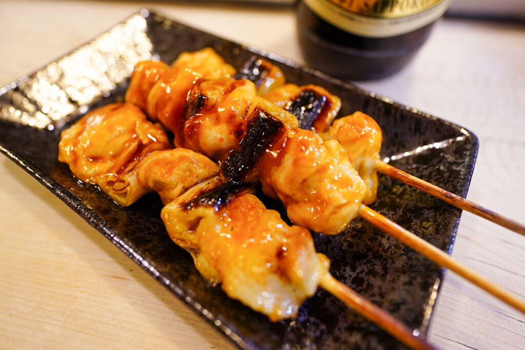 さらに、甘辛いタレがたっぷり絡んだ焼き鳥を追加。香ばしさとジューシーな鶏肉の脂が口いっぱいに広がり、思わず頬が緩みます。