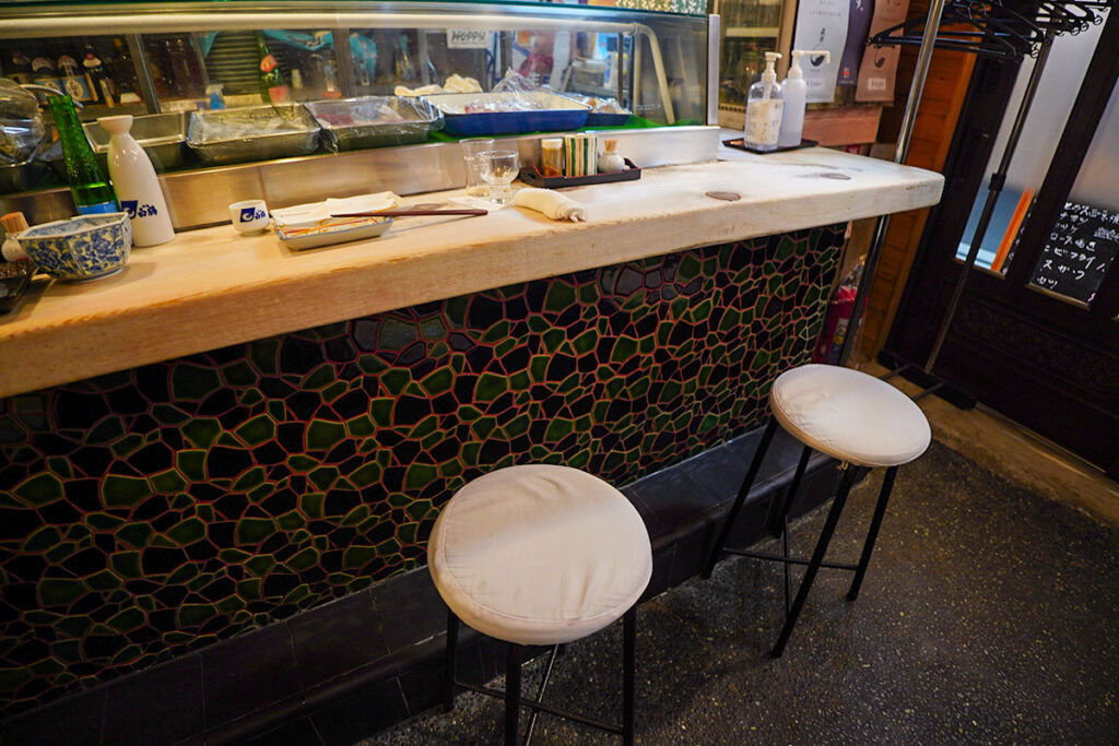 飴色に輝く木枠のメニュー札や、細かなタイル張りの装飾が目を引きます。