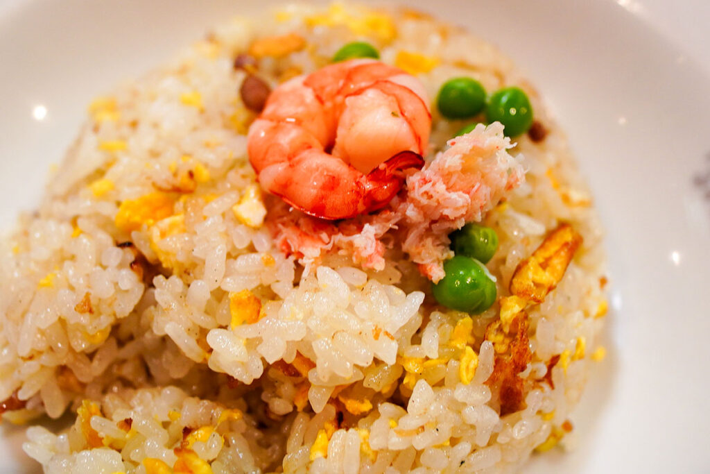 丸く形作られたご飯の頂上には、海老、カニのほぐし身、グリーンピースが乗っています。具材が三種類も添えられた姿は、少し特別感のある仕上がり。