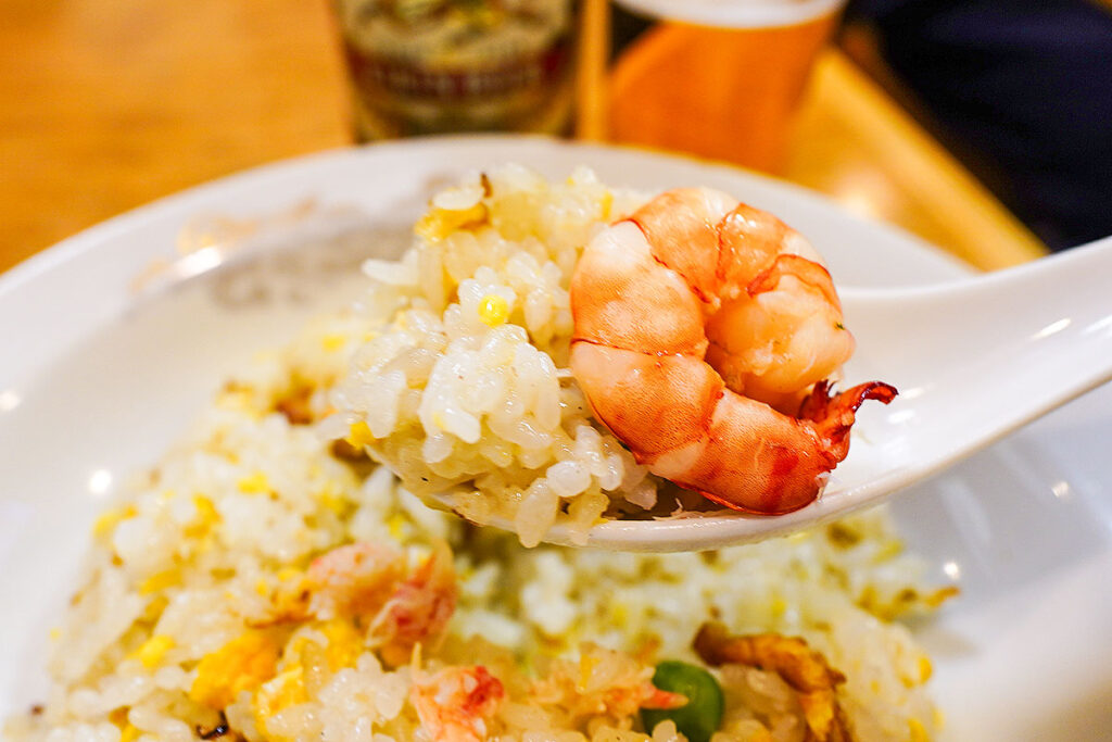 レンゲですくって一口食べると、昨今流行りのパラパラとした食感とは異なる、しっとりとした口当たり。強い調味料に頼らない、素材を活かした優しい塩味で、クラシックラガーの苦味と好相性です。