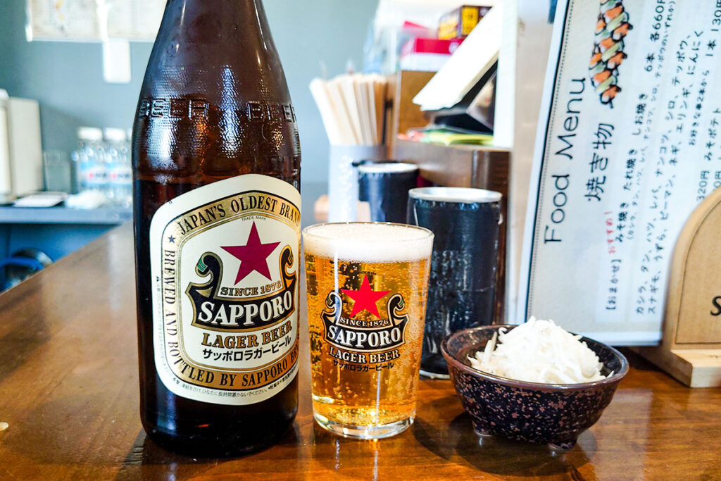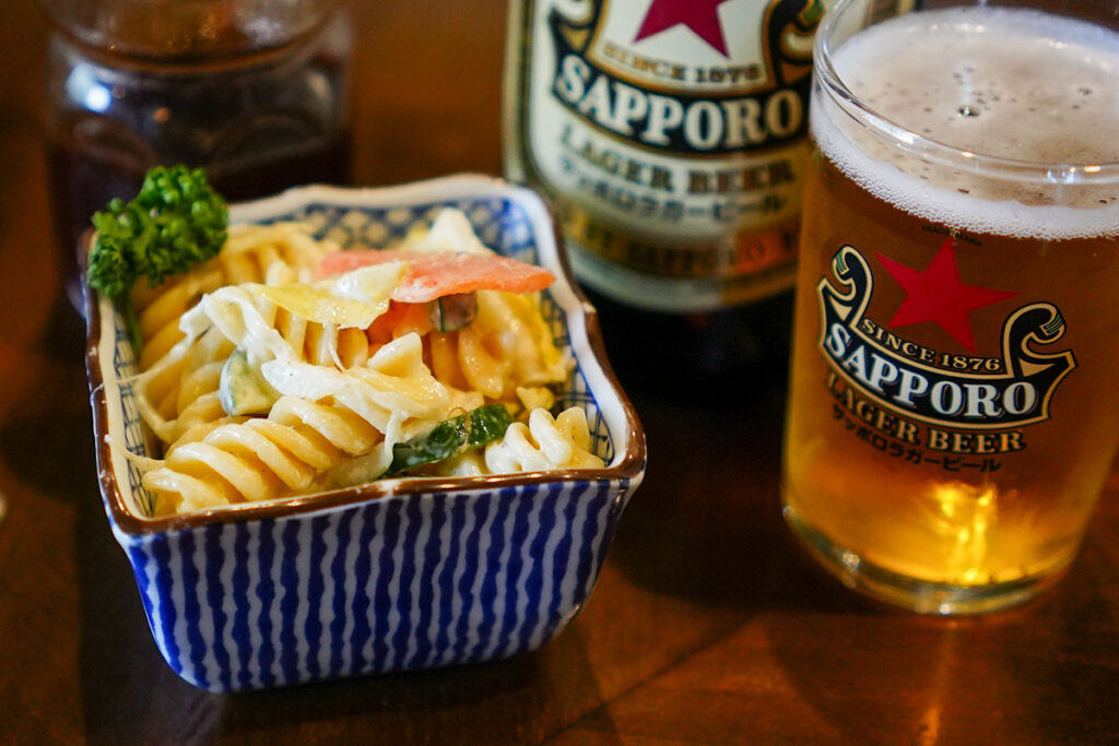 まずは「サッポロラガービール(680円)」の中瓶で乾杯。しっかり冷えた瓶とともに、赤い星がプリントされた専用グラスがでてきました。ちょっぴり嬉しい。