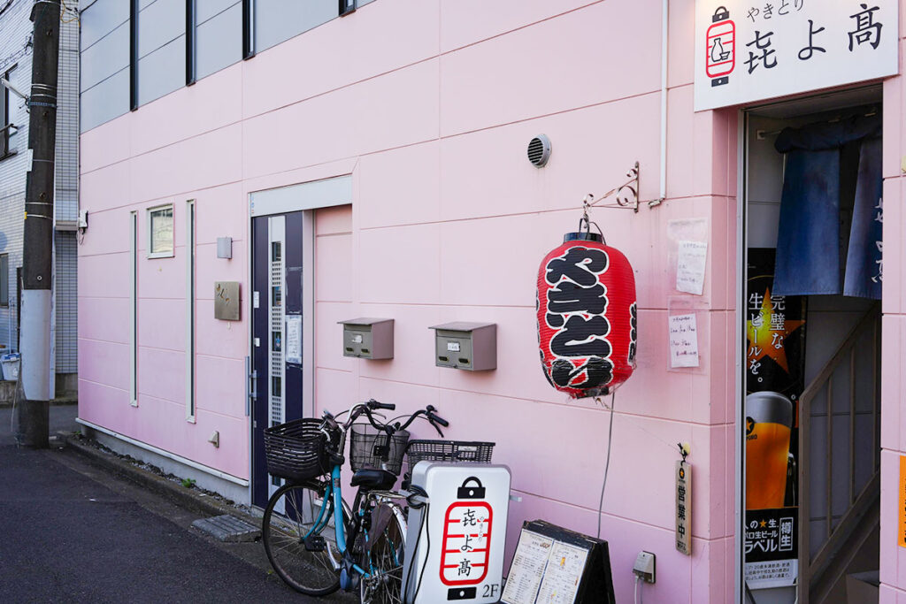 蕨駅西口を出て線路沿いを南浦和方面へ歩くこと約2分。ピンク色の壁が目を引く建物の、細く急な階段を上った2階に『やきとり 㐂よ髙』はあります。扉を開けると、カウンター8席とテーブル席が2つ配置された、20席弱の小ざっぱりとした空間が広がっています。