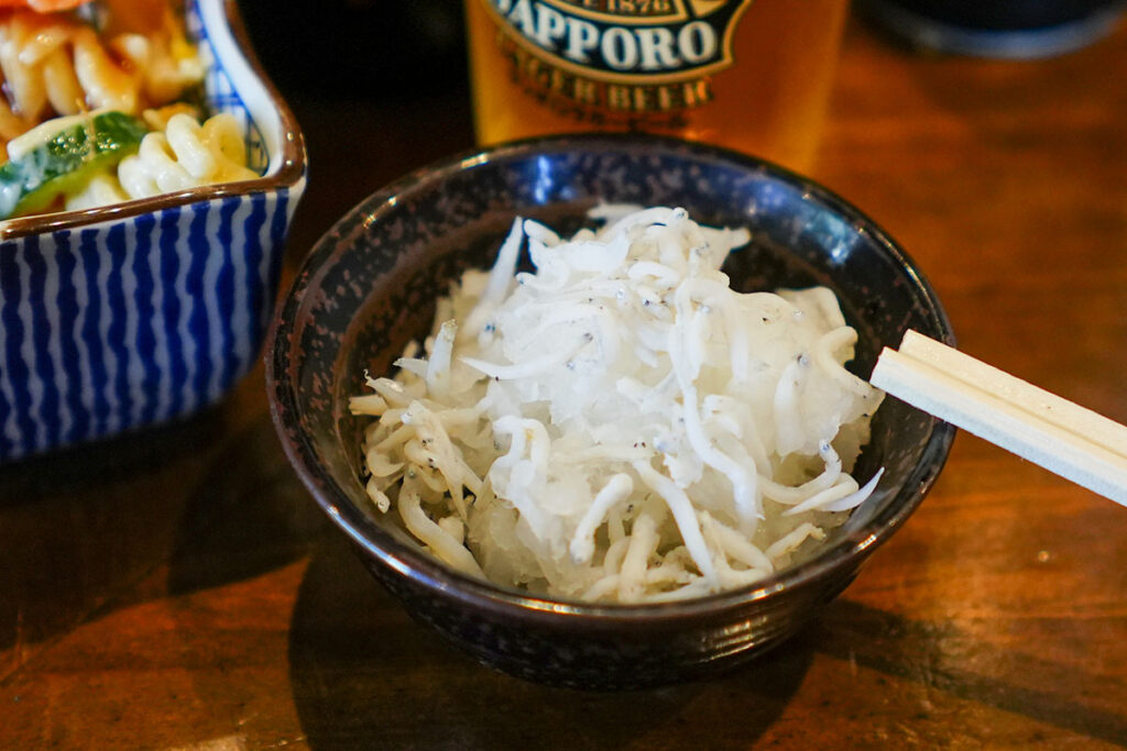 お通し(300円)は、さっぱりとした鬼おろしに、しらすが乗った一品。粗めにすりおろされた大根のザクザクとした食感が心地よく、やきとんの箸休めにも丁度いいです。