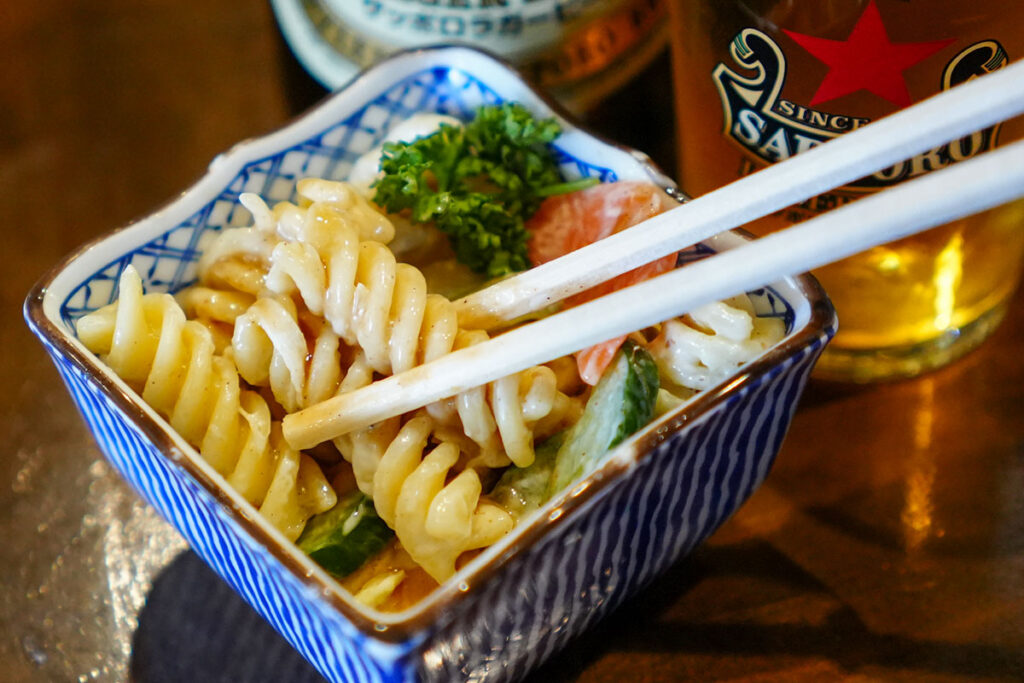 串焼きが焼き上がるまでの間は、「マカロニサラダ(330円)」をつまみます。黒こしょうがピリッと効いた大人の味付け。