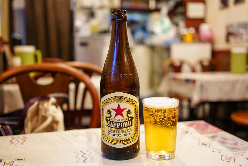 まずはサッポロラガービール、通称「赤星」の大瓶をもらって乾杯。よく冷えたグラスに注ぎ、喉の渇きを心地よく癒やします。ほかにも生ビールをはじめ様々なお酒を扱っているので、中華飲みがしっかり楽しめます。