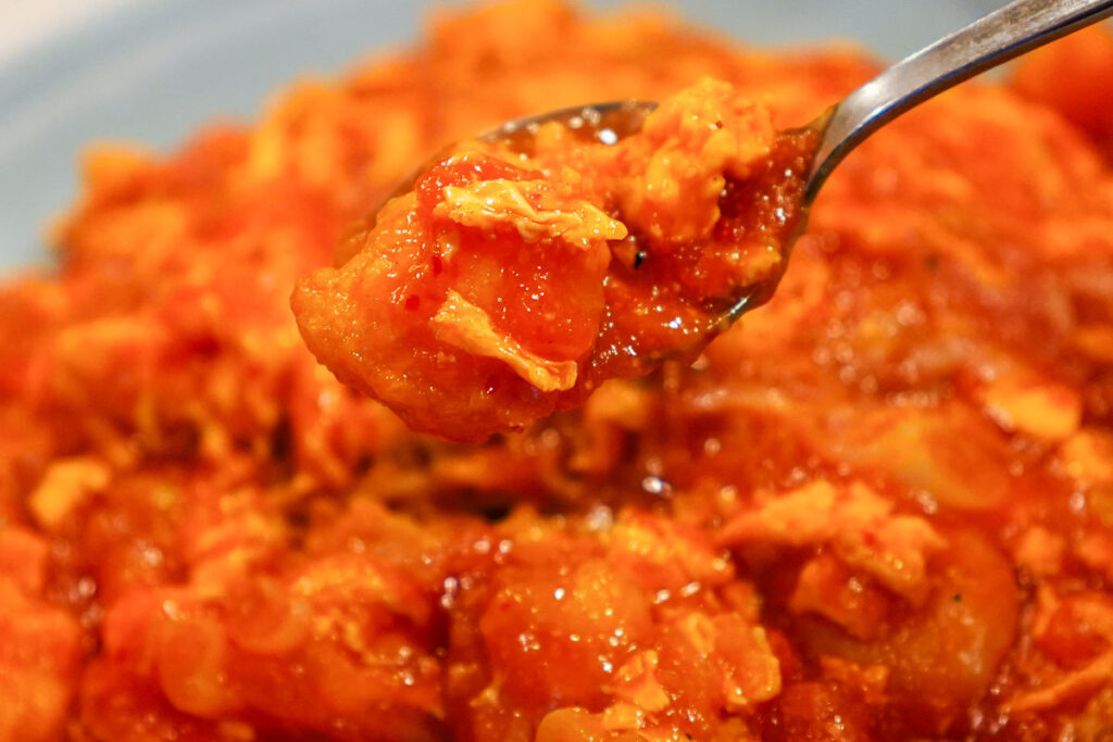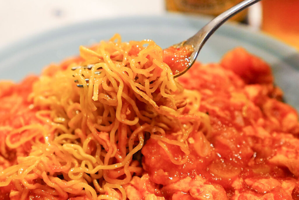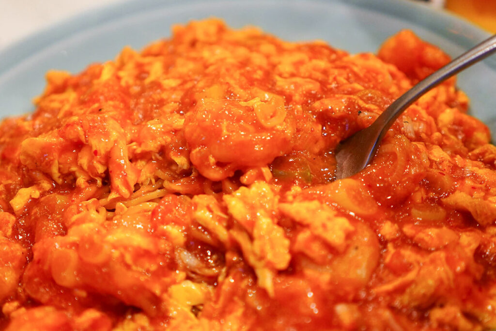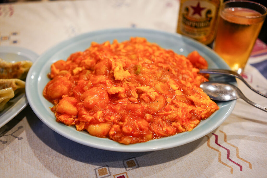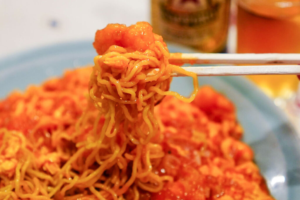 ニンニクの効いた少し酸味のあるチリソースは本格派の味付け。ふんわりとした玉子と、数え切れないほどたっぷり入った弾力のある海老が麺に絡み、1キロくらいあっても最後まで美味しく食べ進められそう。
