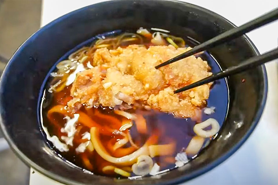 〆は、残しておいた唐揚げをトッピング。つゆをたっぷり吸わせていただきます。コクのあるつゆと肉の脂が馴染んで、ボリューム満点のB級料理の完成です。