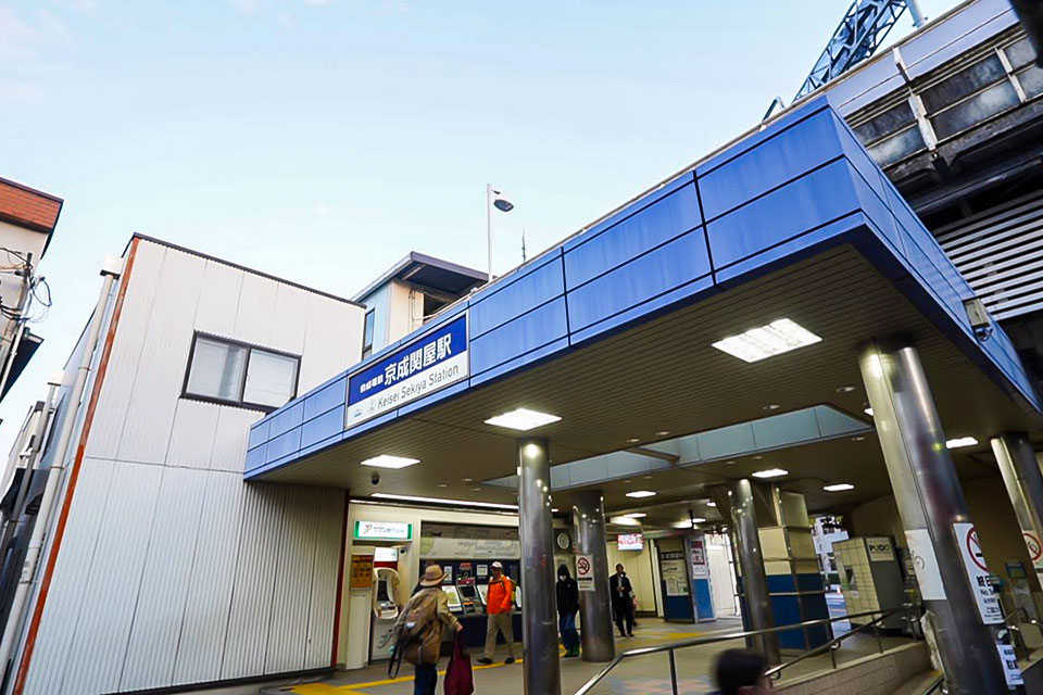 足立区にある京成関屋駅北口を出ると、すぐ目の前が東武線の牛田駅。そのわずかな隙間の通路沿いに、赤い日よけと紺色の暖簾を掲げた『雑賀屋 本店』が店を構えています。