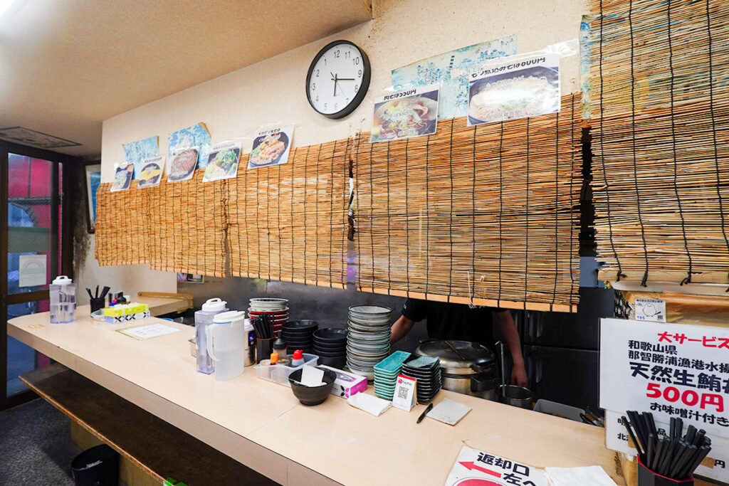 店内は厨房に向かった立ち食いカウンターのみ。すだれが下がり、手書きの短冊メニューが並ぶ空間は、2018年オープンとは思えない雰囲気。