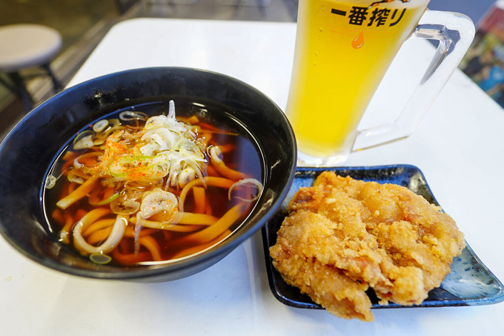 キリン一番搾りとジャンボ唐揚げ、極上太麺の完璧な組み合わせ