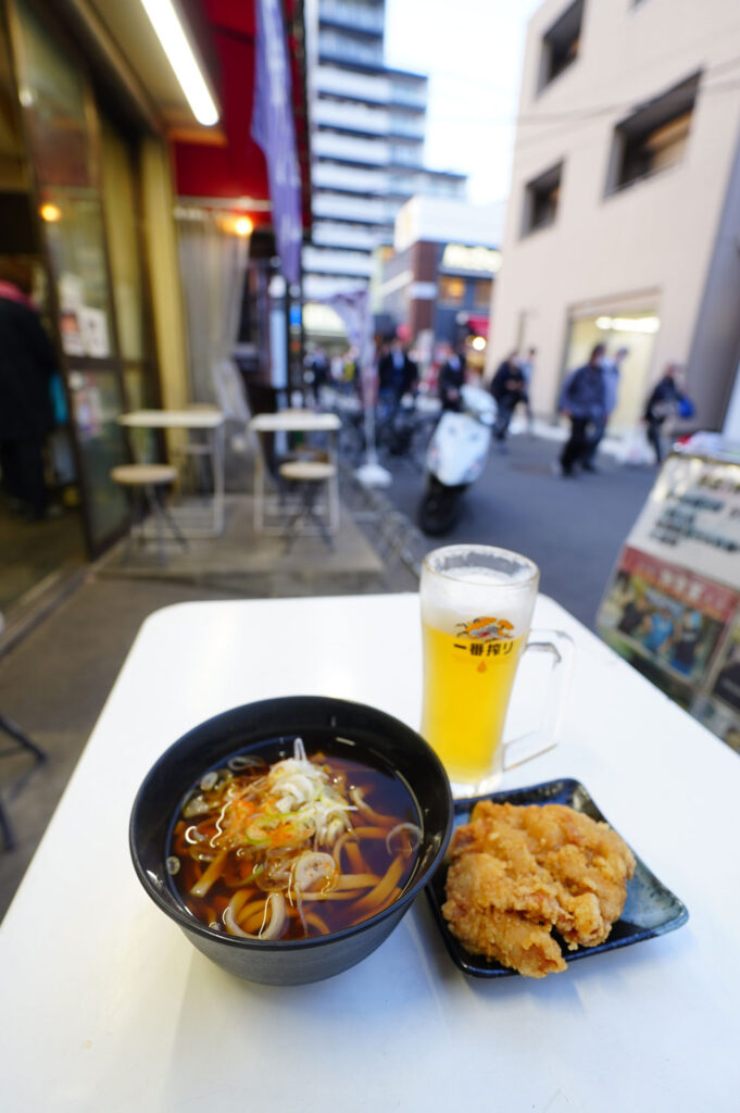 1個100gほどあるずっしり系。かぶりつくと、醤油やニンニクの香ばしい風味が口いっぱいに広がり、鶏もも肉のジューシーな旨味を感じられます。この唐揚げをつまみにビールを飲み進め、さらに鰹や鯖から取った少し甘めで旨味的なものと醤油の立った蕎麦つゆを一口すすると、最高のお酒のお供にぴったり。